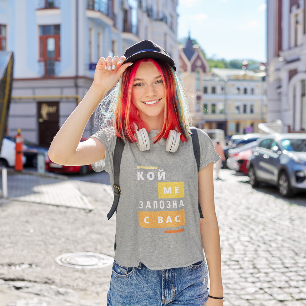 Тениска за тийнейджърки "Кой ме запозна с вас?" – идеалният начин за тийнейджърките да изразят своето чувство за хумор и закачливо отношение към родителите си. Тази тениска е подходяща за момичета, които често се чувстват неразбрани и обичат да си правят шеги. Изработена от мек памук, тениската е изключително удобна за ежедневно носене. Предлага се в широка гама от цветове – черно, циклама, мента, синьо, тъмно синьо, зелено, лайм, бежово, лилаво, оранжево, червено, светло и тъмно сиво, за да пасне на всеки стил.